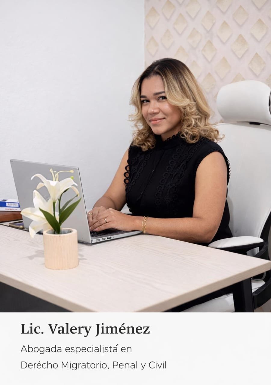 Valery Jiménez es abogada especializada en derecho migratorio, penal, civil e inmobiliario en la República Dominicana. Ofrecemos asesoría legal estratégica, ética y personalizada, acompañando a nuestros clientes en cada etapa de su proceso para garantizar soluciones legales efectivas.